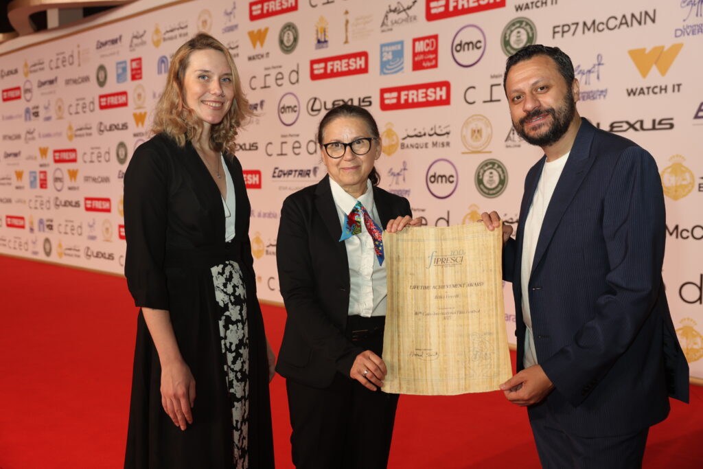 During the 46th edition of the Cairo International Film Festival, FIPRESCI presented the FIPRESCI 100 Lifetime Achievement Award—a special award given by the federation to mark its centenary—to Hungarian director Ildikó Enyedi. The ceremony took place on the evening of November 20 before the screening of her latest film, Silent Friend. The award was delivered by the FIPRESCI president Ahmed Shawky, vice president Elena Rubashevska, and artistic director of CIFF, FIPRESCI member Mohammed Tarek.